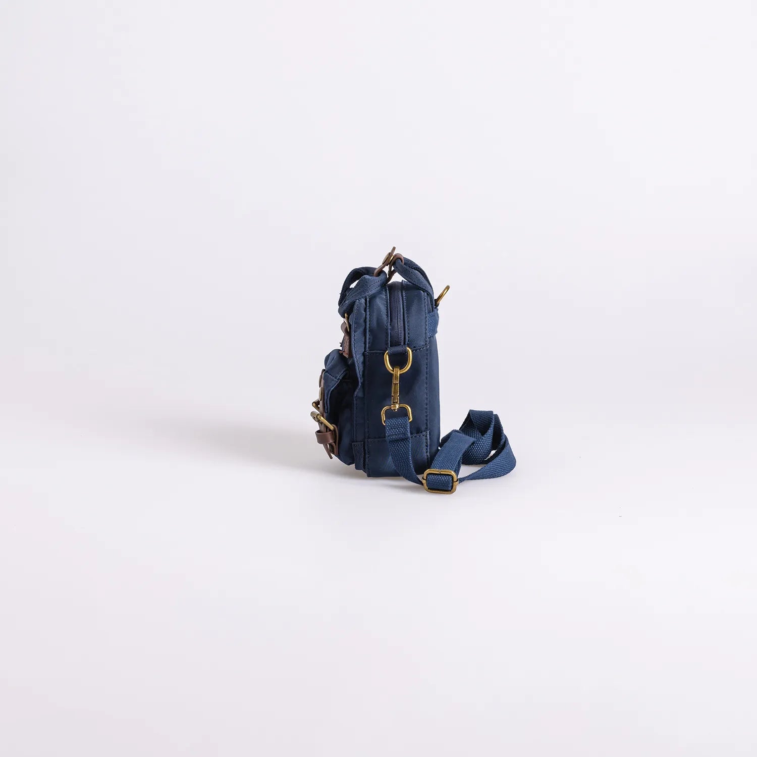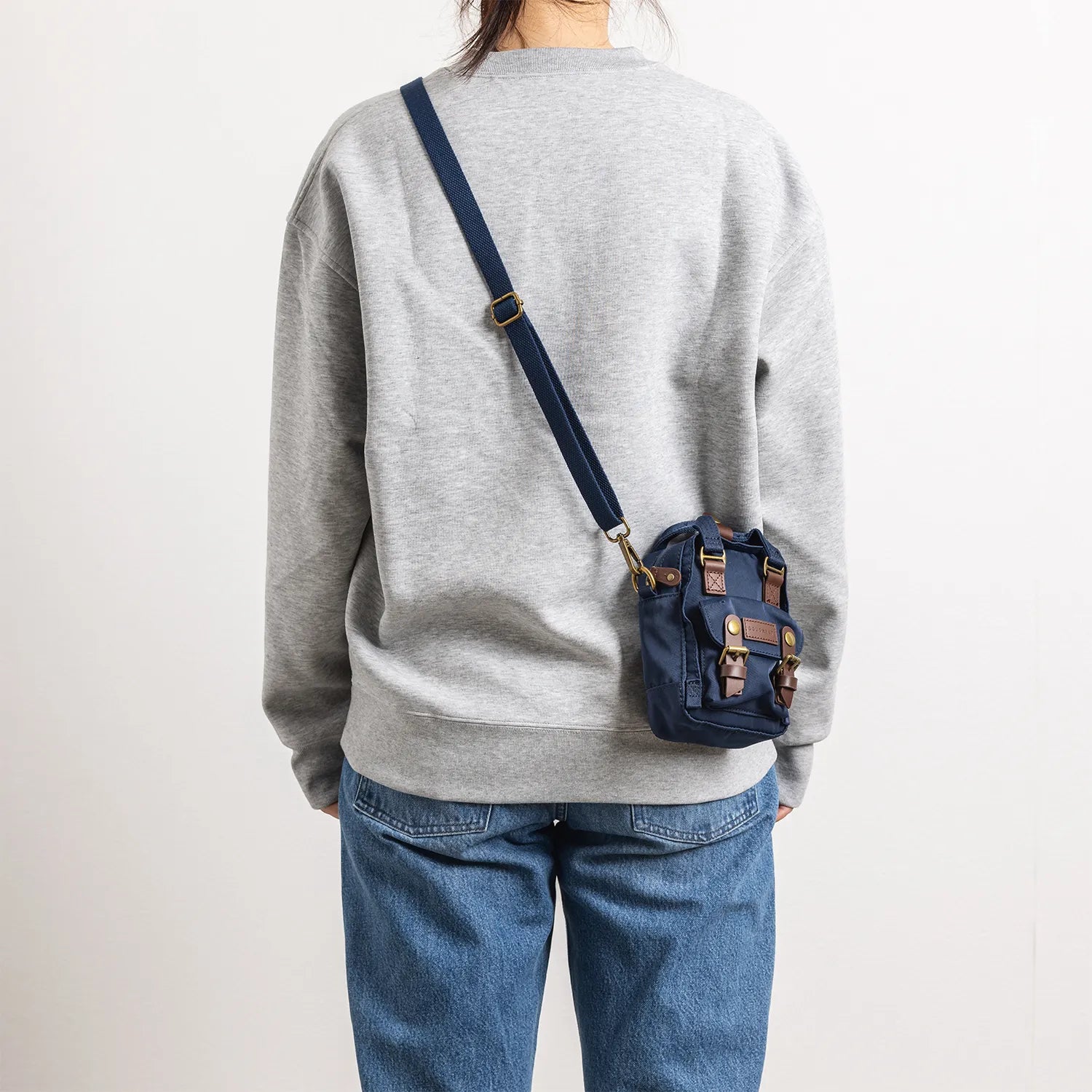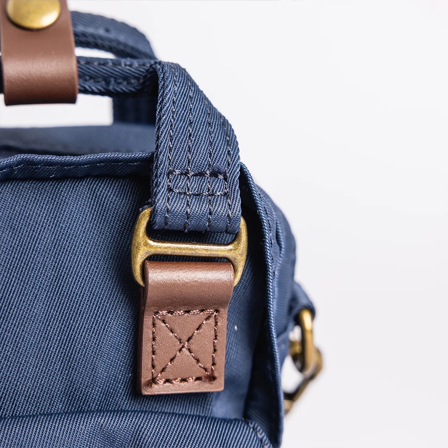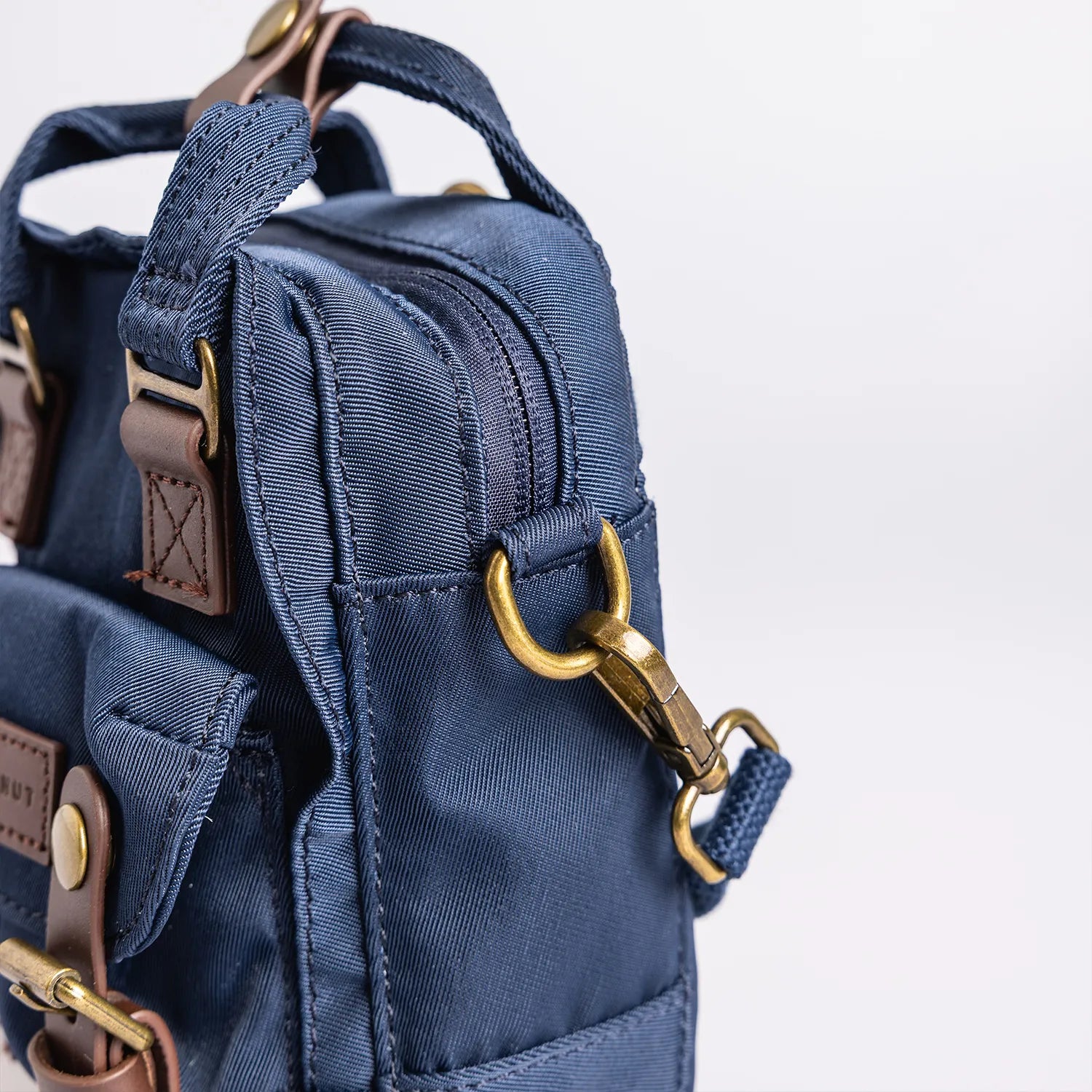 • ネイビーの本体にブラウンのレザーパーツを組み合わせた仕様