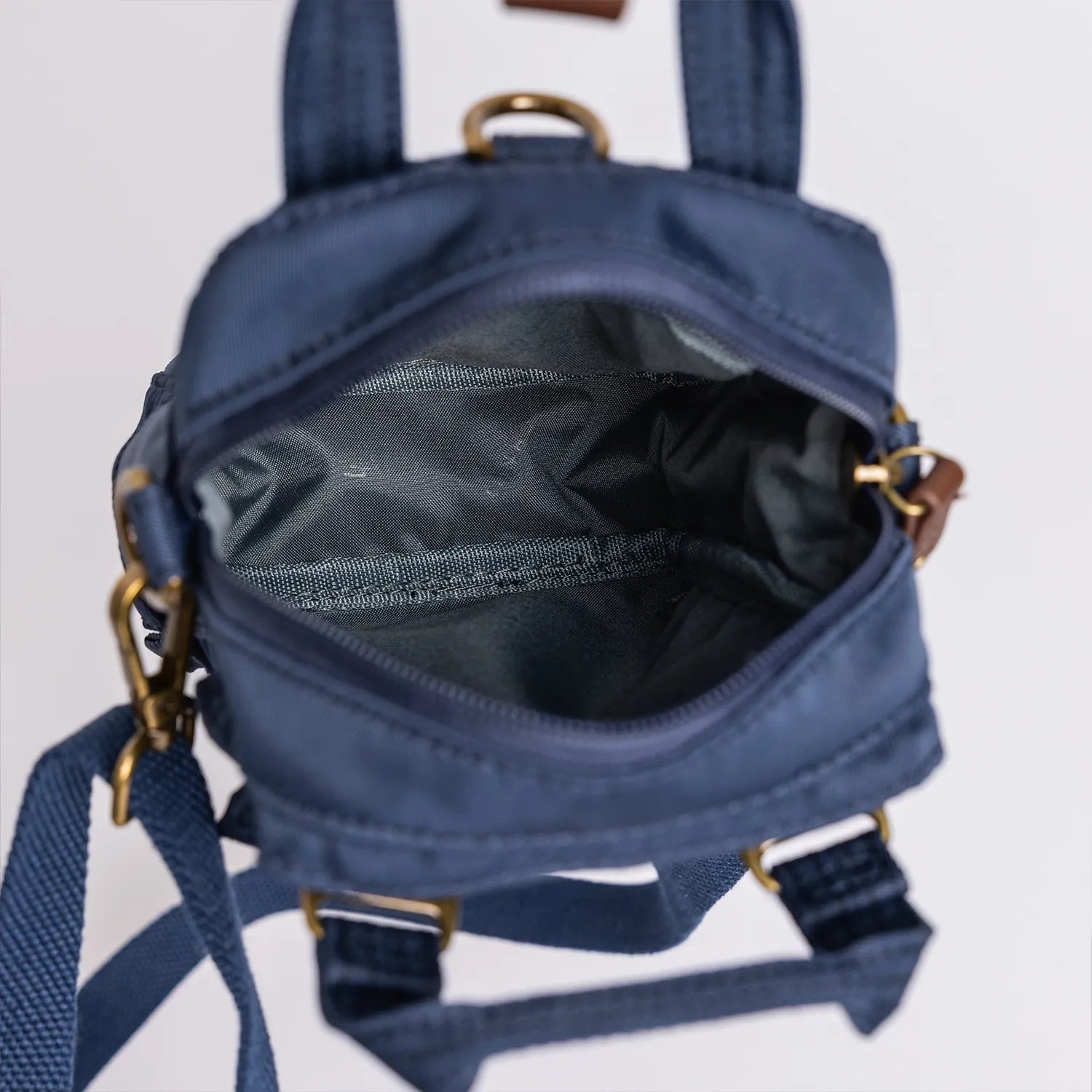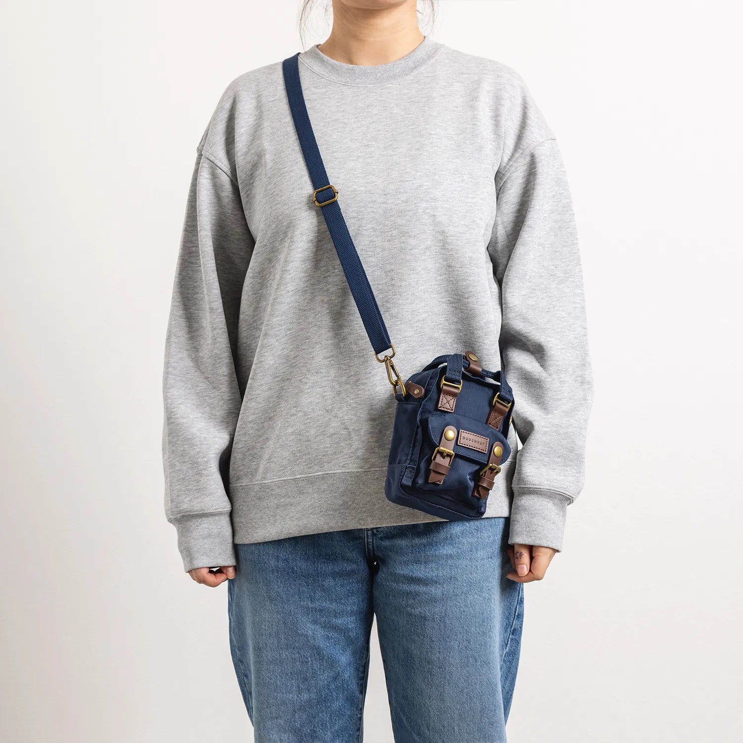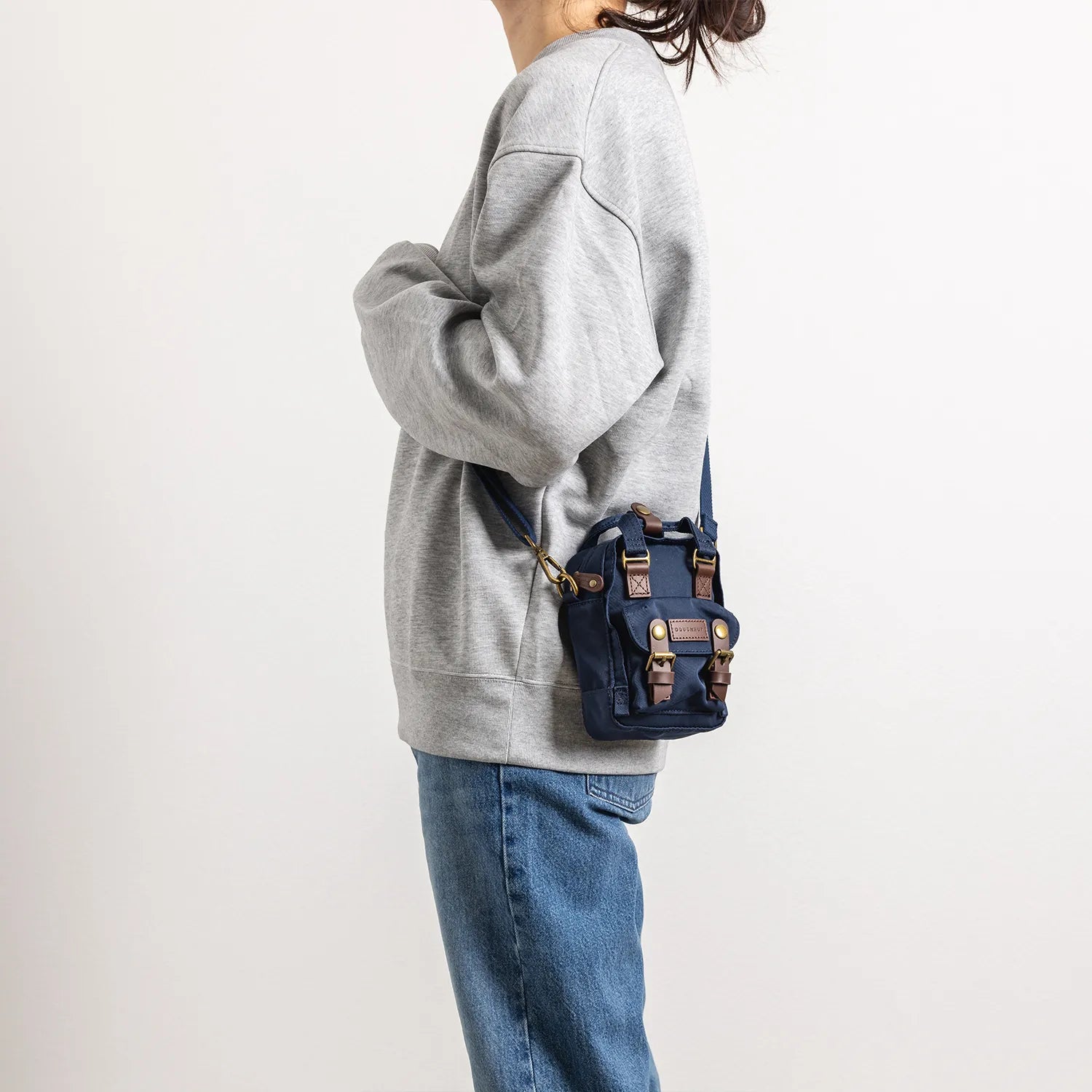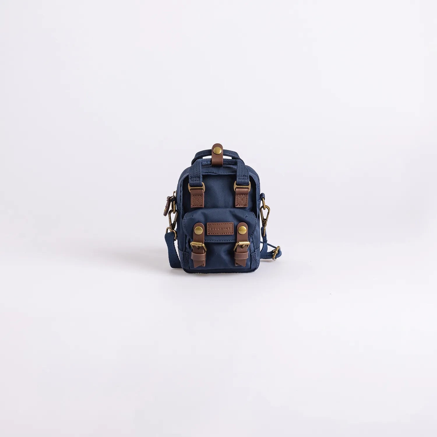 • ネイビーの本体にブラウンのレザーパーツを組み合わせた仕様